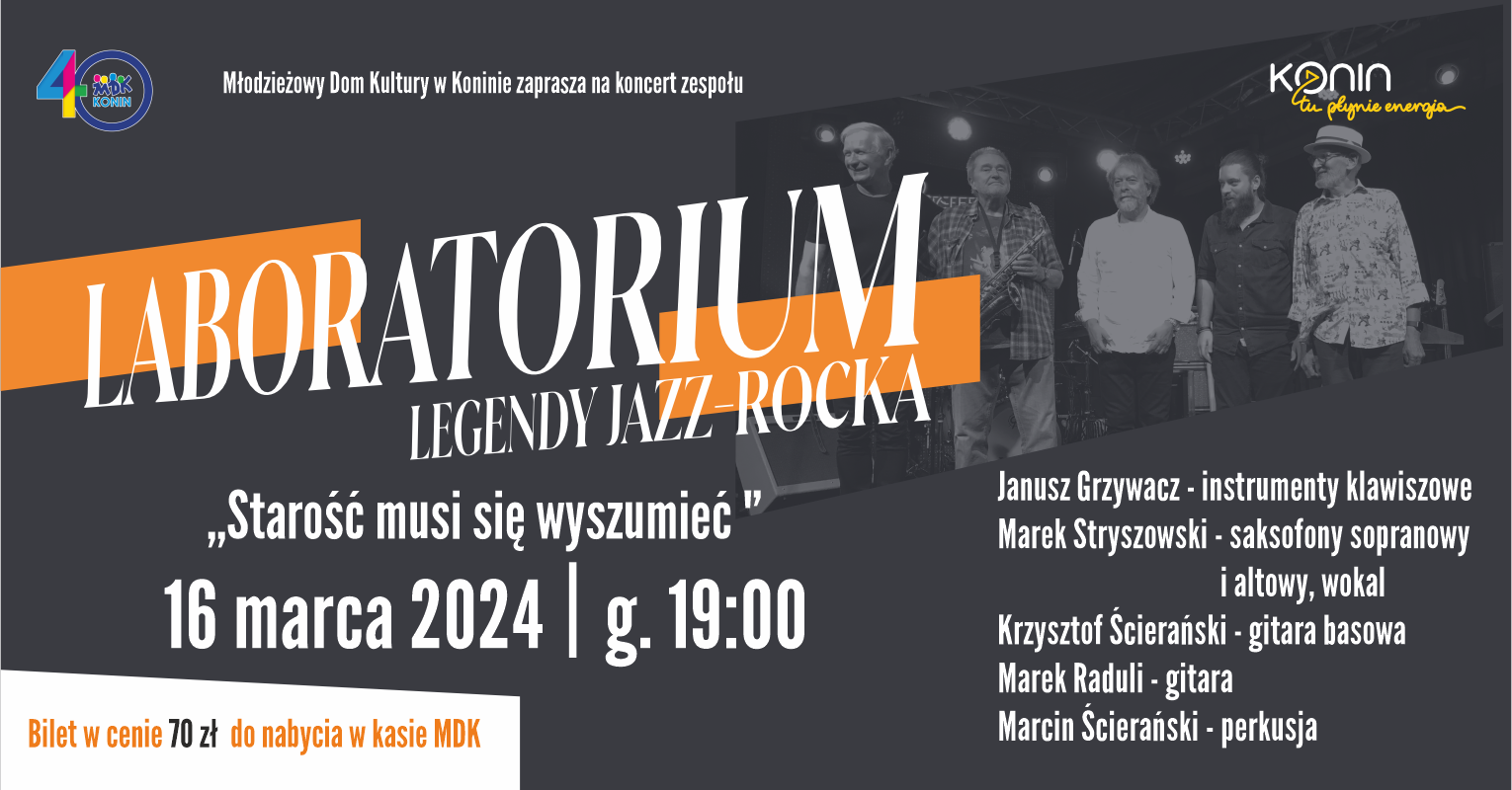 Młodzieżowy Dom Kultury w Koninie zaprasza na spotkanie z muzyką legendy jazz-rocka – zespołu Laboratorium. Koncert ,,Starość musi się wyszumieć” odbędzie się 16 marca o godz. 19. Bilety w cenie 70 zł do nabycia w kasie MDK.