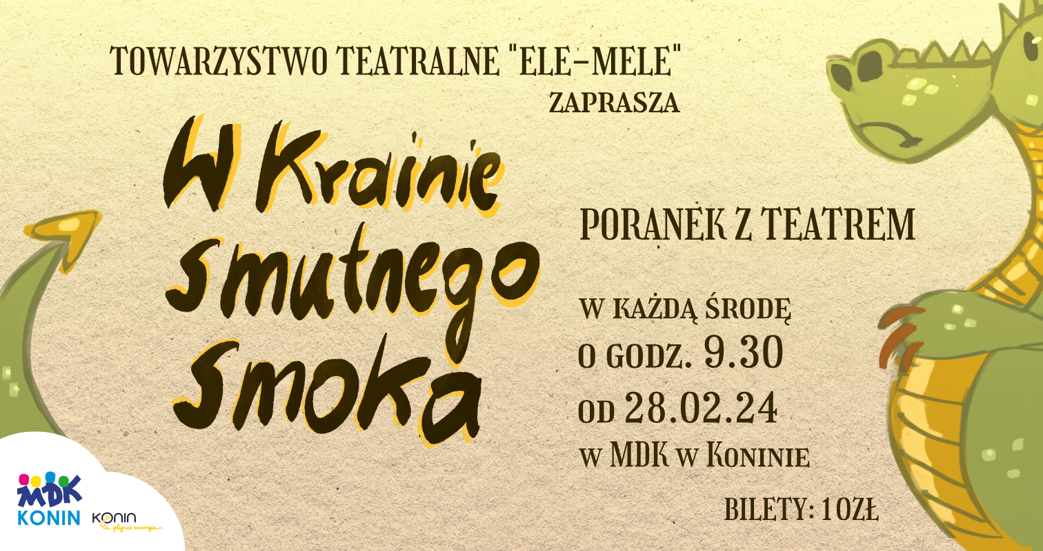 Młodzieżowy Dom Kultury w Koninie od 28 lutego zaprasza dzieci w wieku przedszkolnym i wczesnoszkolnym na absolutnie wyjątkowy spektakl teatralny pt.: ,,W krainie Smutnego Smoka".