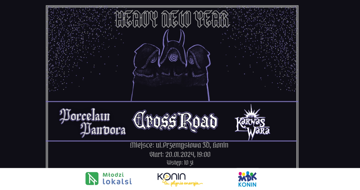 Takiego koncertu jeszcze nie było ! Młodzieżowy Dom Kultury w Koninie oraz Stowarzyszenie ,,Młodzi Lokalsi” zapraszają 20 stycznia o godz. 19 na koncert ,,Heavy New Year". Bilety w cenie 10 zł do nabycia w kasie MDK.
