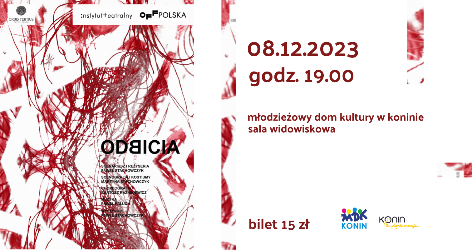 Młodzieżowy Dom Kultury w Koninie zaprasza na kolejny niezwykły spektakl Trzeciego Teatru Lecha Raczaka i Fundacji Orbis Tertius . „Odbicia” odbędą się 8 grudnia o godz. 19. Bilet w cenie 15 zł do nabycia w kasie MDK.