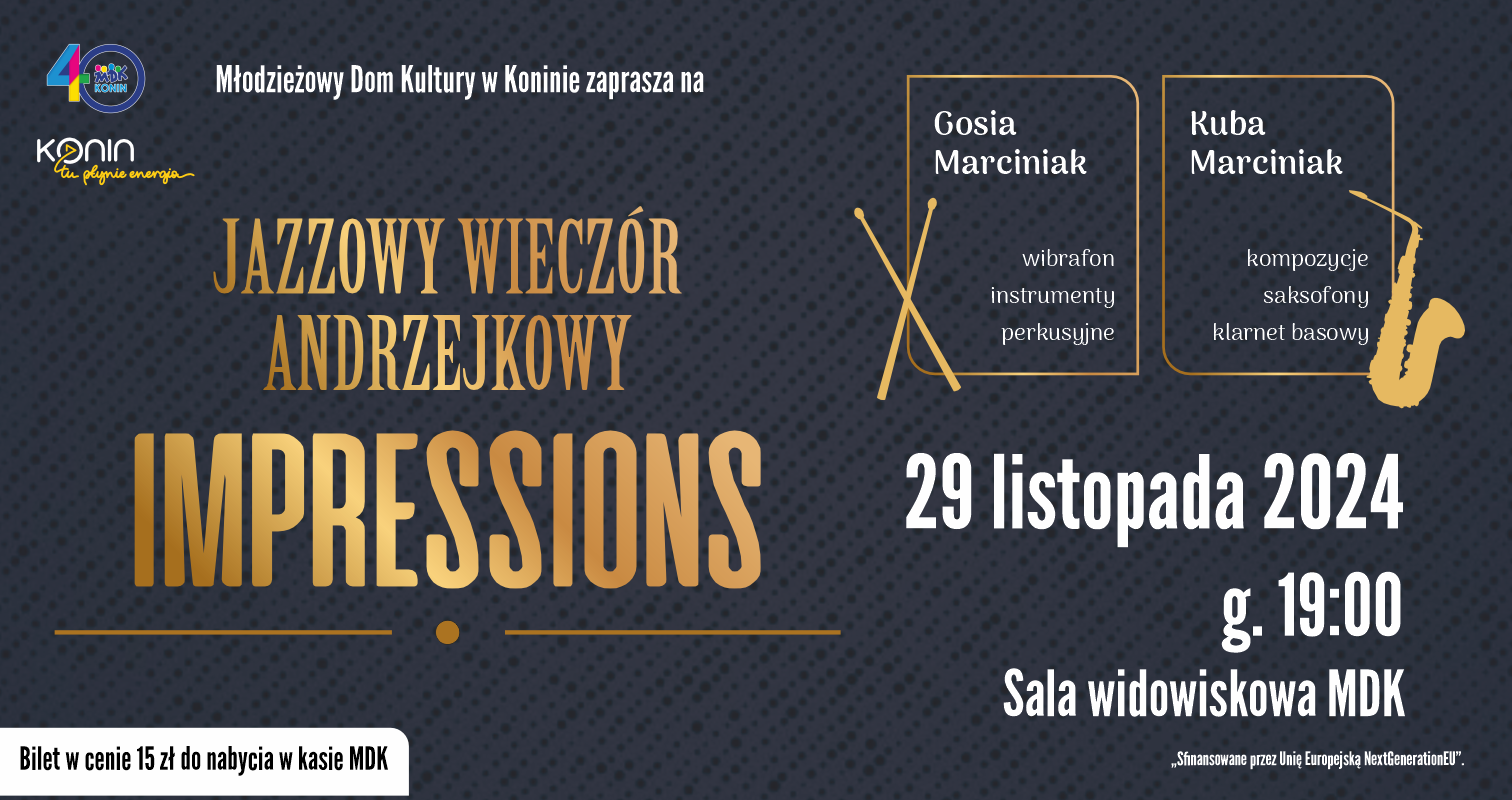 Młodzieżowy Dom Kultury w Koninie zaprasza na Jazzowy Wieczór Andrzejkowy ,,IMPRESSIONS”. Koncert odbędzie się 29 listopada o godz. 19 w sali widowiskowej. Bilety w cenie 15 złotych do nabycia w kasie MDK.
