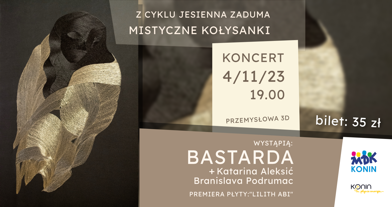 4 listopada w Koninie odbędzie się premiera albumu "Lilith Abi" - będącego efektem współpracy tria BASTARDA z wybitnymi, serbskimi artystkami - Katariną Alekcić (pomysłodawczyni projektu), a także Branislavą Podmurac. Na koncert z cyklu Jesienna Zaduma ,,Mistyczne kołysanki” o godz. 19 zaprasza Młodzieżowy Dom Kultury.