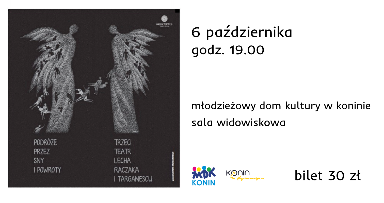 Młodzieżowy Dom Kultury w Koninie zaprasza na niezwykły spektakl ,,Podróże przez sny i powroty” w wykonaniu Trzeciego Teatru Lecha Raczaka i Trio Targanescu.