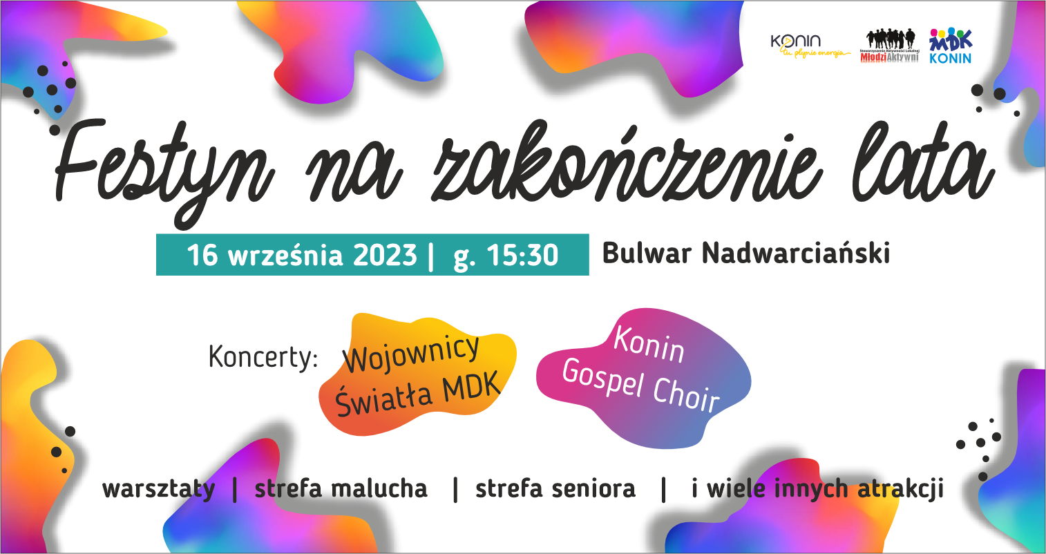 Młodzieżowy Dom Kultury w Koninie, Towarzystwo Inicjatyw Obywatelskich oraz Stowarzyszenie Aktywności Lokalnej ,,Młodzi Aktywni” zapraszają na Festyn na Zakończenie Lata. Impreza odbędzie się 16 września od godz. 15.30 na Bulwarze Nadwarciańskim.