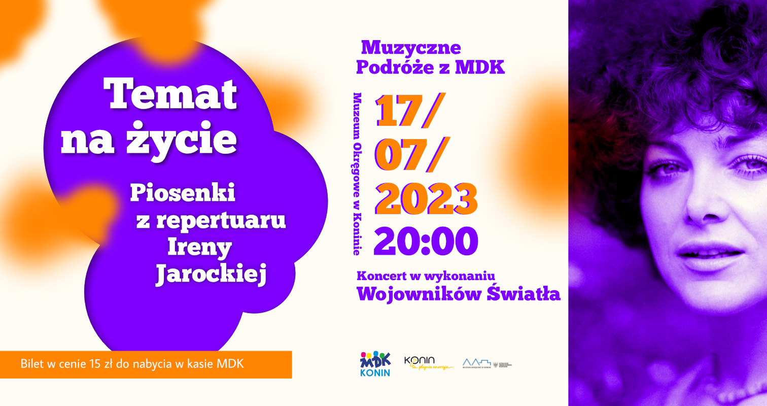 Już po raz drugi w lipcu Młodzieżowy Dom Kultury w Koninie zaprasza na Muzyczne Podróże z MDK. Tym razem 17 lipca odbędzie się koncert ,,Temat na życie ” - piosenki z repertuaru Ireny Jarockiej.