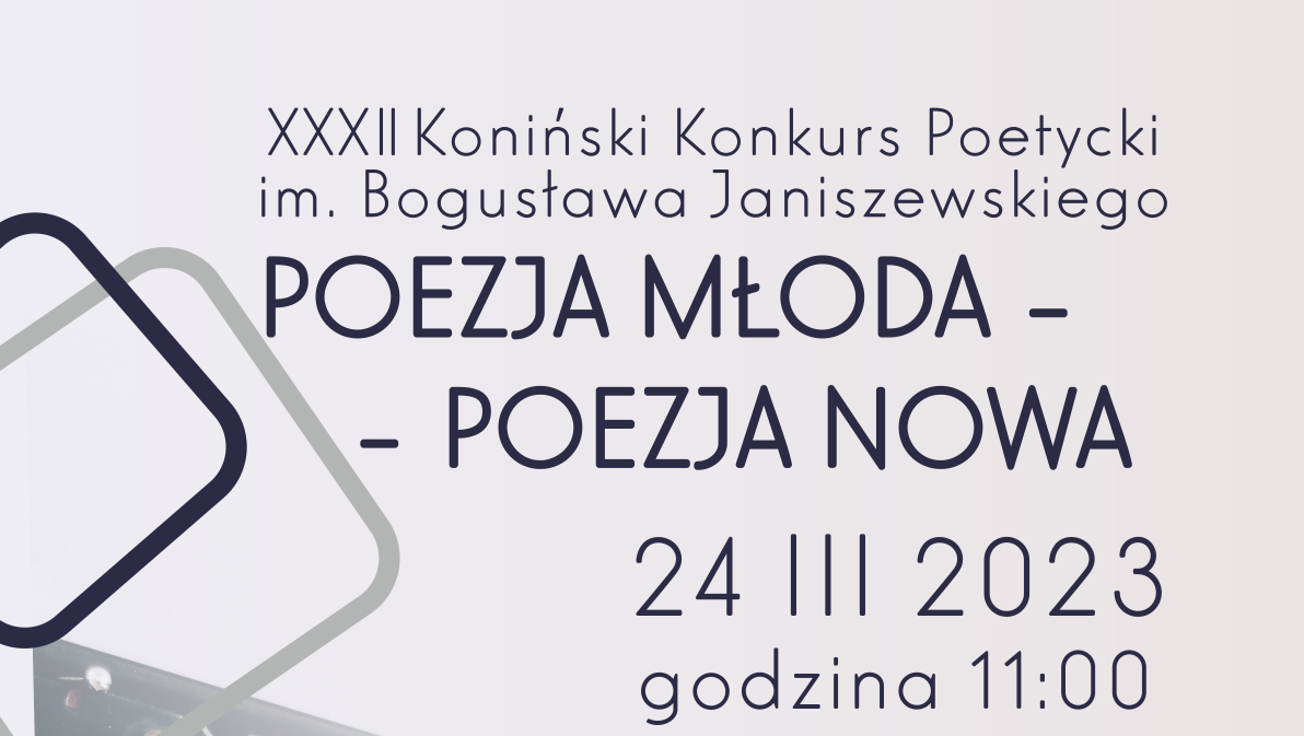 21 marca obchodzony jest Światowy Dzień Poezji. Młodzieżowy Dom Kultury w Koninie włącza się w obchody tego święta. Otóż 24 marca na godz. 11 zapraszamy młodych poetów z regionu konińskiego na rozstrzygnięcie XXXII Konińskiego Konkursu im. Bogusława Janiszewskiego „Poezja młoda – poezja nowa”. Podczas tej imprezy poznamy laureatów konkursu w 4 kategoriach wiekowych: klasy 1-3, 4-6 i 7-8 szkoły podstawowej oraz w kategorii uczniów szkół ponadpodstawowych. Patronat nad konkursem objął Instytut Filologii Polskiej UAM w Poznaniu.
