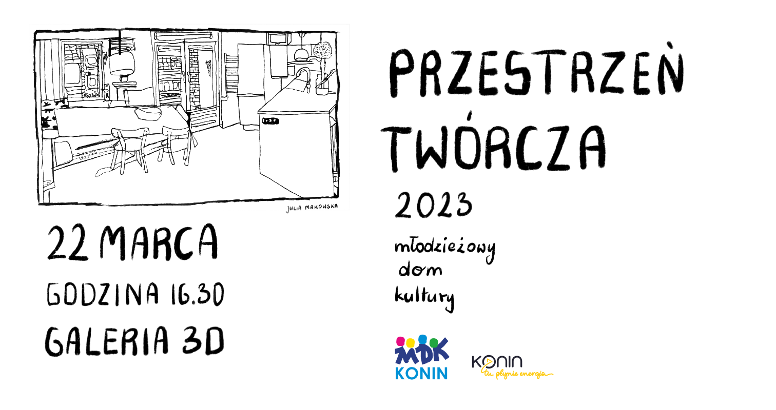 Serdecznie zapraszamy na wystawę pt. „Przestrzeń Twórcza”, która jest podsumowaniem artystycznych działań w Pracowni Sztuk Pięknych oraz Klubu Rysunku i Malarstwa w Młodzieżowym Domu Kultury w Koninie pod kierunkiem Marty Kornalskiej. Otwarcie wystawy odbędzie się 22 marca o godzinie 16.30 w Galerii 3D. Na wystawie będziemy mogli podziwiać prace rysunkowe, malarskie, kolaże, a nawet grafikę projektową.