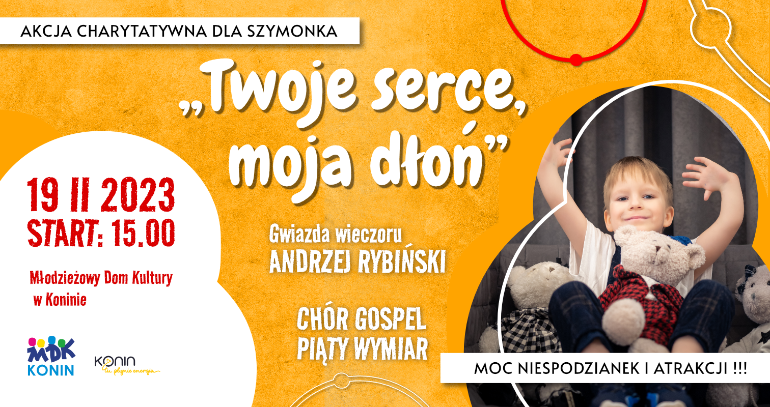Młodzieżowy Dom Kultury w Koninie oraz mama Szymonka zapraszają na jedyną w swoim rodzaju akcję charytatywną ,,Twoje serce, moja dłoń”. Całkowity dochód z imprezy przeznaczony zostanie na leczenie 6-letniego chłopca w Paley European Institute w Warszawie. Rodzina zebrała już 520 tys.zł, brakuje jeszcze 210 tys.zł. Liczymy na Wasze gorące serca !