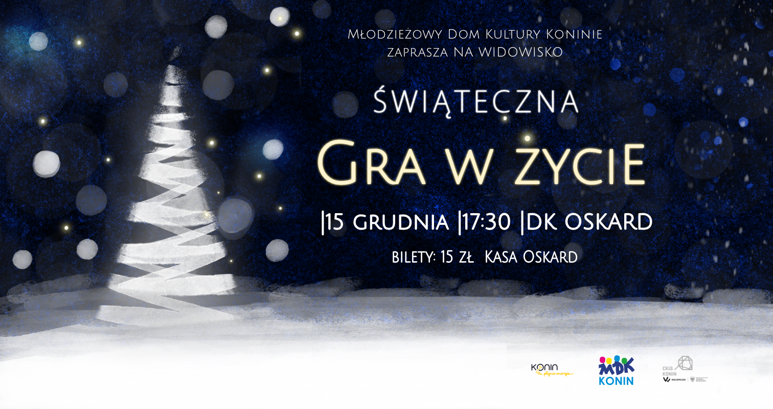 Młodzieżowy Dom Kultury w Koninie zaprasza na nowe, świąteczne widowisko ,,Gra w życie”. Co ciekawe świąteczne, ale bez kolęd. 15 grudnia w DK Oskard o godz. 17.30 będzie zaskakująco i na pewno refleksyjnie. Widowisko pozwoli nam na chwilę zatrzymać się i pomyśleć o tym co w życiu najważniejsze.