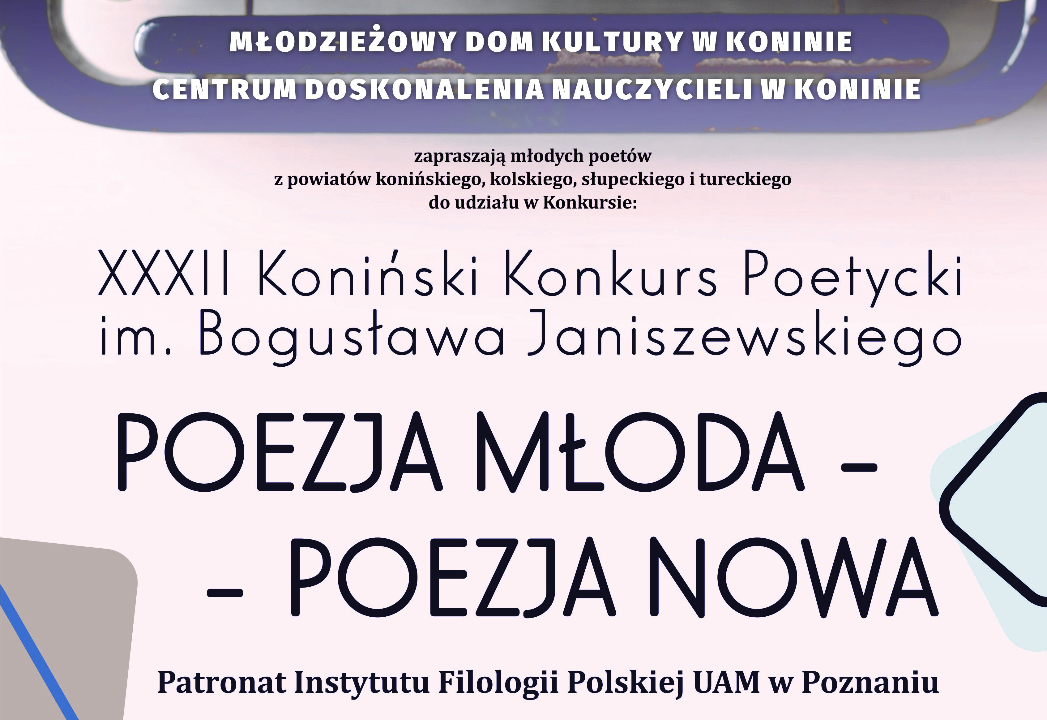 Wszystkich, którzy posiadają choć odrobinę talentu literackiego zapraszamy do udziału w XXXII Międzypowiatowym Konińskim Konkursie Poetyckim im. Bogusława Janiszewskiego „Poezja młoda – poezja nowa”.