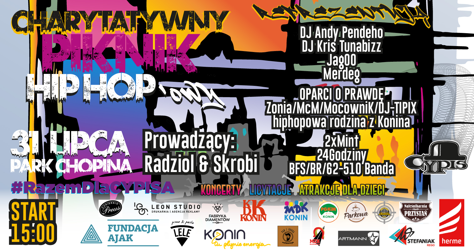 Zapraszamy Was na charytatywny piknik hiphopowy ,,Razem Dla Cypisa" W trakcie imprezy 31 lipca w parku Chopina zaplanowane są atrakcje dla dzieci i koncert z licytacjami. Wystąpią wykonawcy z Polski i zagranicy.